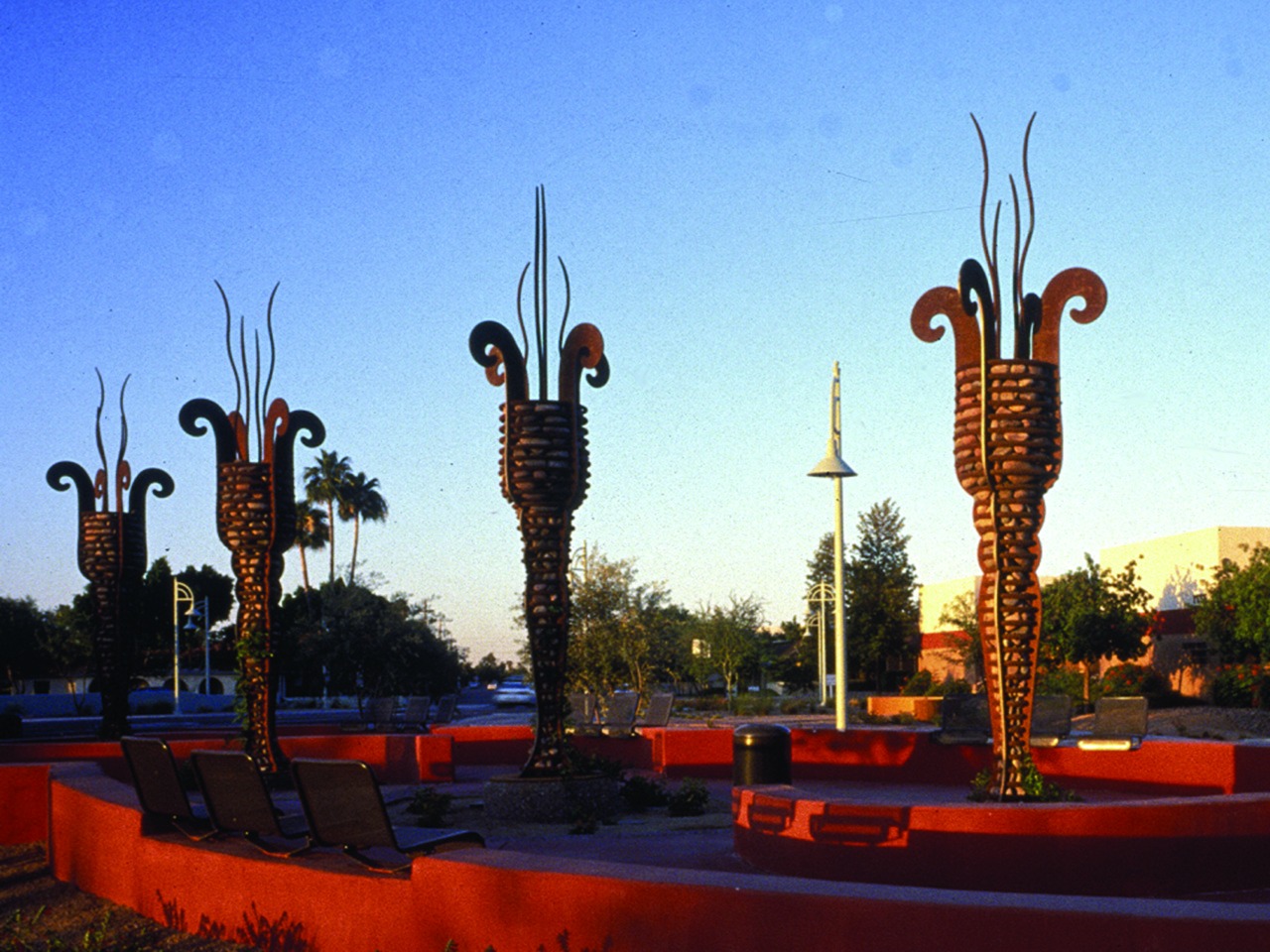 Artist Kevin Berry created Hummingbird Sanctuary with five 16-foot-tall sculptures in the form of stylized trumpet vine flowers to create a sanctuary for hummingbirds and humans alike. Each spring, trumpet vines engulf the sculptures in attractive greenery and blossoms. Berry used Cor-ten steel, rebar, river rocks, and stained aggregate to create this peaceful area along Drinkwater Boulevard.