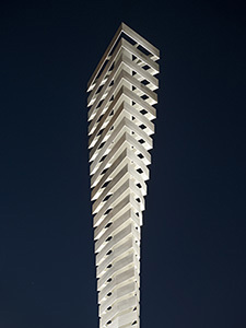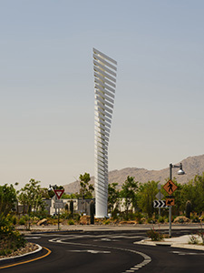 TRI-HEX-CIRC is a vertical, painted steel sculpture, installed May 31 at north Scottsdale’s Raintree Drive and Hayden Road roundabout. It geometrically transforms from a circle at its base to a hexagon in the middle and, finally, to a triangle at the top as it lifts more than 50 feet, engaging the ever-changing desert light and expansive sky.
